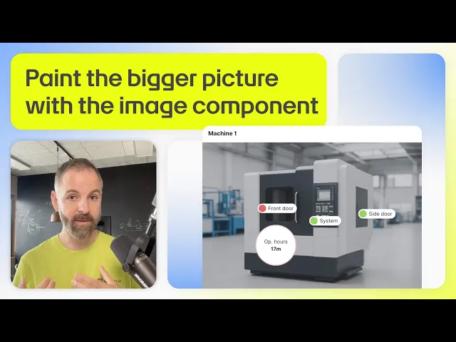 The image component lets you pin data to specific objects within an image. This makes it easier to visualize critical information in context. It supports pixel images (JPEG, PNG) and vector images (SVG), as well as a variety of marker styles and sizes.